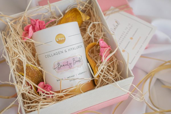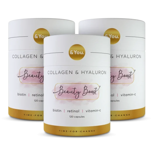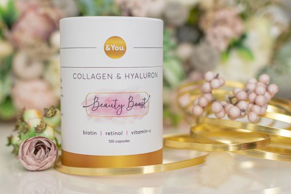 Az &You Beauty Boost prémium minőségű, hidrolizált marha kollagént, hialuronsavat, retinolt, biotint, illetve C-vitamint tartalmaz. Egy napi adag 2 darab kapszulát tartalmaz. Így a 120 szemes kiszerelés két hónapig gondoskodik szépségedről dobozonként.