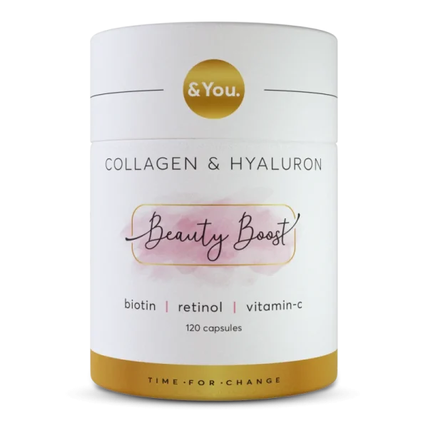 Az &You Beauty Boost prémium minőségű, hidrolizált marha kollagént, hialuronsavat, retinolt, biotint, illetve C-vitamint tartalmaz. Egy napi adag 2 darab kapszulát tartalmaz. Így a 120 szemes kiszerelés két hónapig gondoskodik szépségedről.
